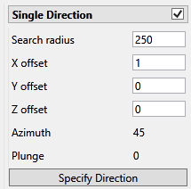 Next, click the Specify Direction button and a panel like the one shown below will be displayed. Use this panel to set the direction parameters. Enter the azimuth and plunge you in which you want to calculate, and the maximum amount of offset you are willing to allow to achieve that direction.