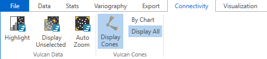 You can visualise the search ellipses by enabling the option to View Cones in Vulcan, or by clicking Display Cones from the Connectivity tab in the ribbon. The cones are interactive, therefore, any changes made in the variogram parameters will be automatically reflected in the cones seen in Vulcan.