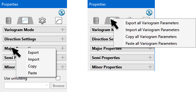 This feature allows you to import, export, copy, and paste variogram parameters for different variogram charts. You can export (or copy) one or more parameters and, under certain conditions, import (or paste) one or more parameters. These options are available by right-clicking the parameters expander related to them for individual parameters or right-clicking the Variogram Properties tab.