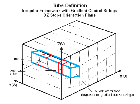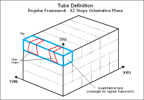 The tube, a three dimensional volume defined by the stope face and the framework extents in the W direction (transverse). The seed-slice, seed-shape and stope-shape are defined within the extents of the tube. The Slice Method optimisation is applied within the individual tubes, independently, and each tube is assigned a unique quadrilateral or QUAD number.