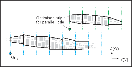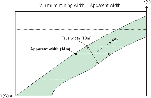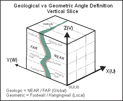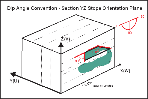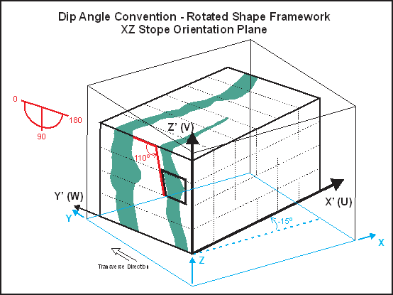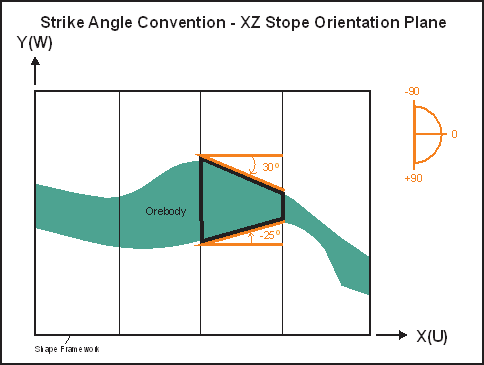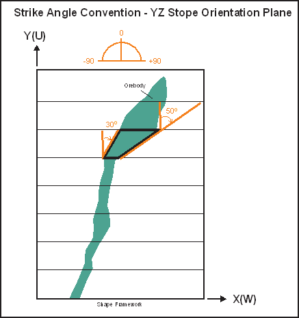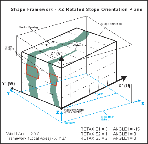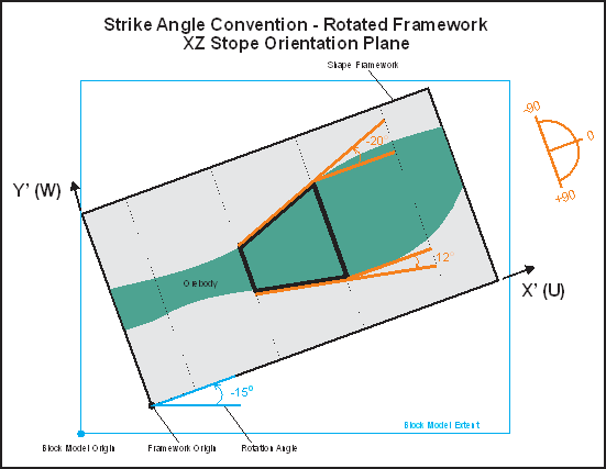 An example of where a rotated framework may be utilised is where an orebody may have a strike orientation of 300o/120o azimuth and dip sub-vertically 70o to the east. The most logical un-rotated stope-shape framework orientation to select, in this example case, would be the Slice Method Vertical XZ framework, such that stope annealing occurs in the transverse W-axis direction (i.e. in the north-south azimuth with bearing of 0/180o). However, this stope-shape framework may be re-oriented to be more parallel with the primary strike-axis of the orebody such that W-axis annealing occurs at right-angles to the orebody (e.g. azimuth bearing of 30/210o). This example could also be further complicated whereby the block model framework has also been rotated such that its orientation is more favourable for geological interpolation purposes.