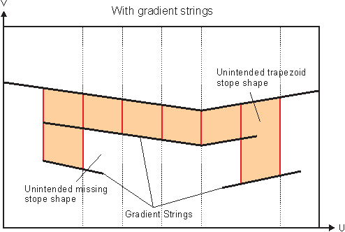 A stope face is created where a pair of gradient strings intersects adjacent sections. Ideally the control-strings should have the same orientation as the stope-framework U-axis.