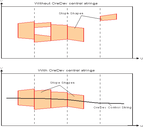 OreDev strings do not change the framework, and should be added as an option to a second-pass run. The strings are typically used to control the location of stopes and pillars from section to section. They define practical level layouts by constraining the transverse lateral extents of stope-shapes for parallel lodes (i.e. W-axis direction). The strings can also be used to constrain the strike extents (U-axis) to say remove strike outliers.