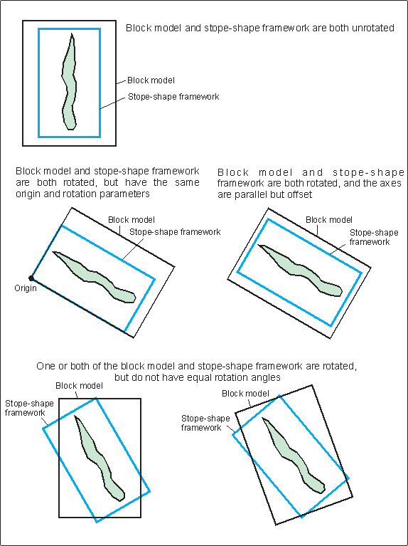 The block model rotations may be the same or different to the stope-shape framework rotations. The rotated block model is defined in local coordinates and world coordinates via rotation parameters. The following describes the various cases.
