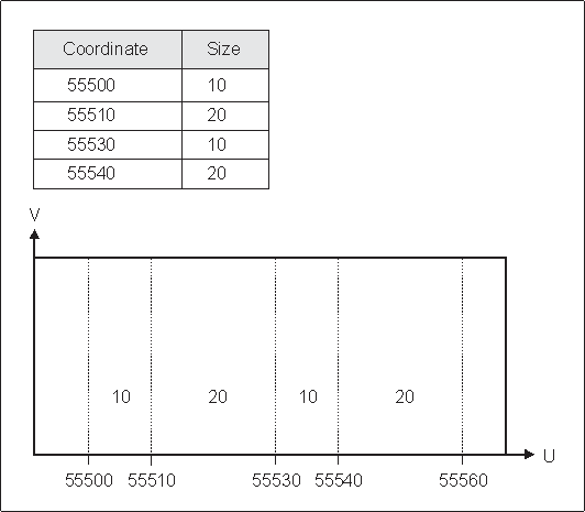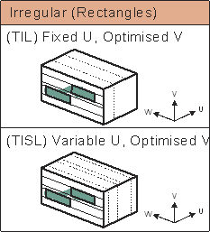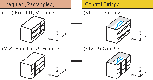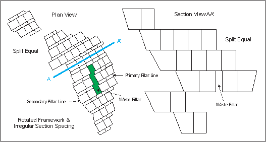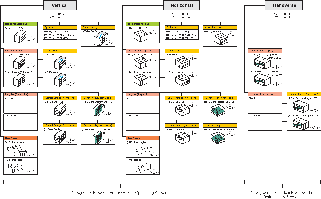 Irregular frameworks; where either one of the U or V-axis intervals is variable. For example, like having 4x25m levels and 1x15m sill pillar level for a mine block covering 115m vertical extent which is repeated, or like having 15m primary and 20m secondary stopes along strike (for vertical orientations).