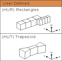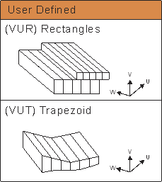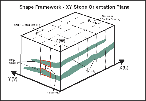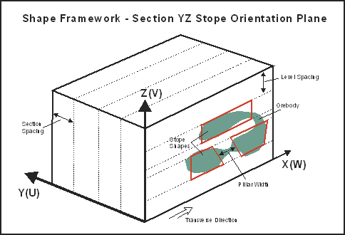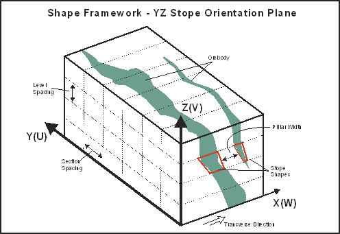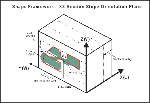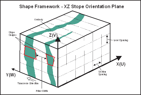 User Defined frameworks; where coordinates are provided to define long section (U, V) dimensions of the stope-shape geometry. The coordinates can represent either rectangular shapes (orthogonal), or trapezoidal or quadrilateral shapes (non-orthogonal).