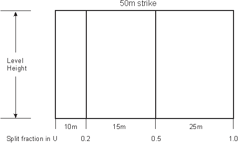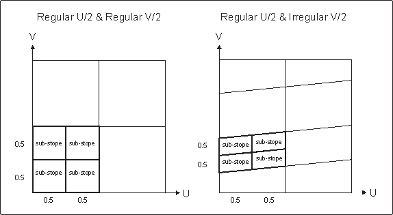 The stope sections (U-axis) may be regularly spaced or irregularly spaced. At the same time, the stope levels (V-axis) may be regularly spaced, irregularly spaced or irregularly spaced with variable gradient.
