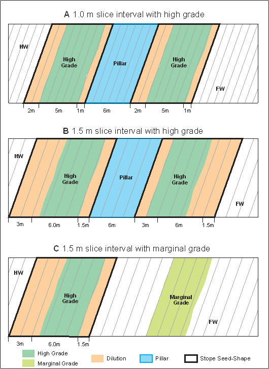 A stope slice interval where the minimum stope width is 3-5 times the slice interval is usually a good guide.
