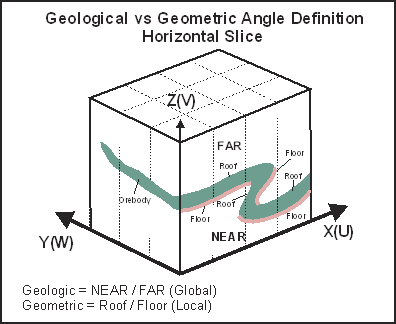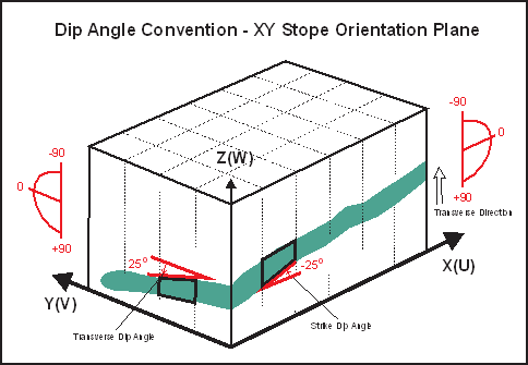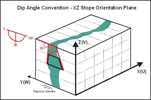 In almost all cases the model discretisation plane and the stope orientation plane for the framework will be identical, but this is not the case if the rotations for model and stope-shape framework are different. Beware the case where one is rotated by 90 degrees relative to the other so that the axes look to be parallel but the XZ plane of one is the YZ plane of the other.