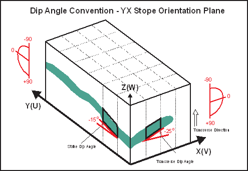 U-axis is the primary strike direction of the stope-shapes (i.e. length),