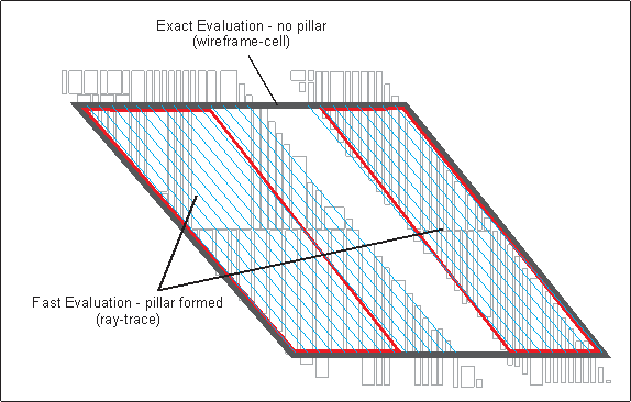 A case example where tall cell columns represent the orebody geology is illustrated in Figure 2 ‑ 57 . If the default discretisation parameters are used (4x4) then depending on the evaluation method applied, Fast Evaluation or Precise Evaluation, the outcomes can be significantly different. The issue for Fast Evaluation, in this case example, is the influence each cell column has as the cell’s centroid falls within or outside of the stope-shape during annealing. The best result would be obtained if subcells are orientated horizontally, not vertically, for this case.