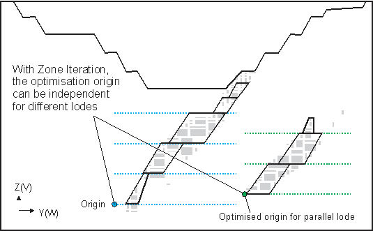 If a zone iteration field is defined in the block model and each zone is spatially separate, then the framework position and extent will be optimised for each zone. The set of possible zones is nominated by a list. These zones can be different lodes, pods or even independent mine areas.