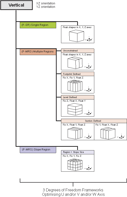 The Prism method also requires a stope-shape framework, but uses the decomposition of the framework extents to define sub-problems. The framework extent is subdivided in regular intervals, much like regular quadrilaterals, except that the subdivision is three dimensional rather than two dimensional, and each subdivided volume is referred to as aregion, whereas the Slice method subdivision is two dimensional to form atube. Figure 3‑1 summarises the stope framework hierarchical structure for the Prism method.