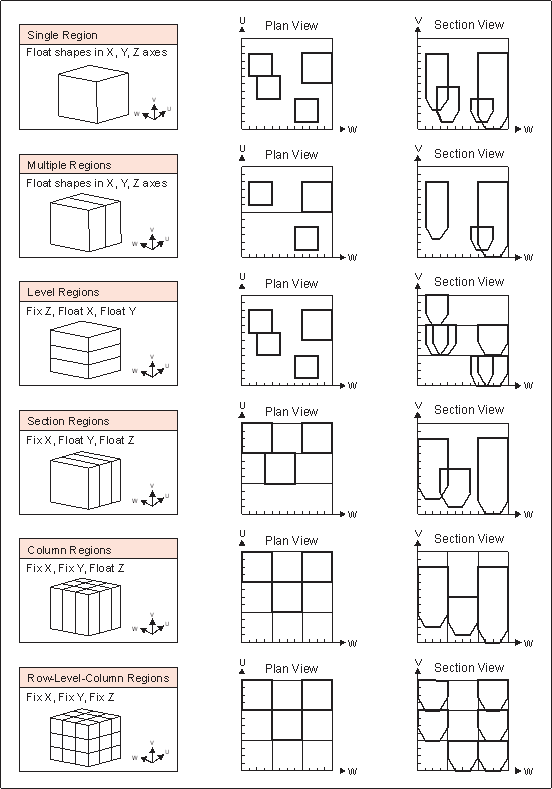 The full framework definition may contain several regions that may be independent or contiguous abutments. This could be likened to a mine-site with mine sub-districts / areas / zones. The framework region(s) however must be rectangular in shape. Regions are user defined to make stoping geometric sense e.g. to span a group of levels or to span a group of sections or to span a group of levels and sections. The library of stope-volumes is applied to each region in turn with each region optimised independently. One use of regions is to force stope-volumes to honour say a regular level spacing or a regular section width (i.e. regular primary and secondary stopes).