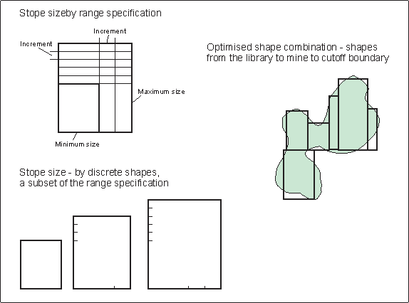 Stopes from the library would typically have dimensions that are an integer multiple of the grid increment, otherwise gaps would occur between adjacent stopes. The size of the grid increments might in some cases be the minimum stope dimension.