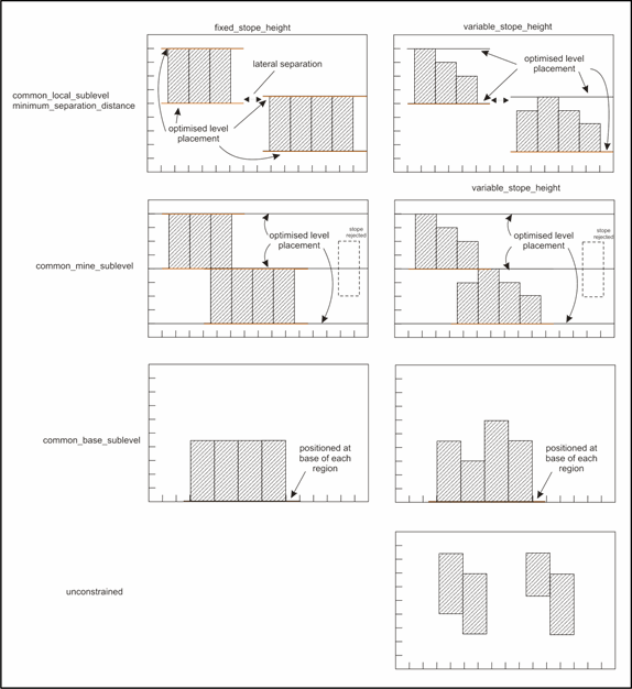 This is a function modifier for the “common_mine_sublevel” and “common_base_sublevel” options. Enabling this sub-option allows variable height stopes to be created between sublevels (e.g. it allows the creation of say “half-height”, “three quarter height” if these stope-shape options are specified in the shape library). The results from this option are illustrated on the right hand side in Figure 3 ‑ 6.