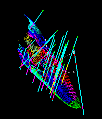 This technique is commonly used for tabular or undulating surfaces or horizons. Raw data is used to interpolate the values at a series, of evenly spaced grid nodes. In the Vulcan grid calculator, each node carries four values, x,y,z and w, where the z and w values may be substituted by any available variable. This facility makes the module extremely useful for the visual analysis of structural, geophysical and geochemical data. For a geophysical analysis the topography may be coloured according to the values of an aero-magnetic survey, affording easy evaluation of the effect of the topography on the results. In a geochemical analysis, the Z value may be substituted by the gold value, and the resulting topography coloured by another variable, say arsenic.
