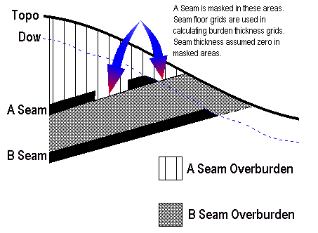 Often it is necessary to calculate reserves on mineable horizons. This will usually mean burdens outside the subcrop of a seam will be mined and assigned as waste to that seam. Also, it may be practical to report burden to a seam even if that seam is missing due to some geological feature (for example a "want" or area where coal thins to below recoverable mining thickness).