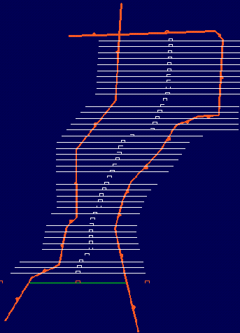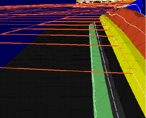 Using another Grid Calc macro, create limit polygons for each bench. Store them in a design database for use in Rsvute. Each bench limit line is generated from the intersection of the bench toe grid and topography (Diagram 2).