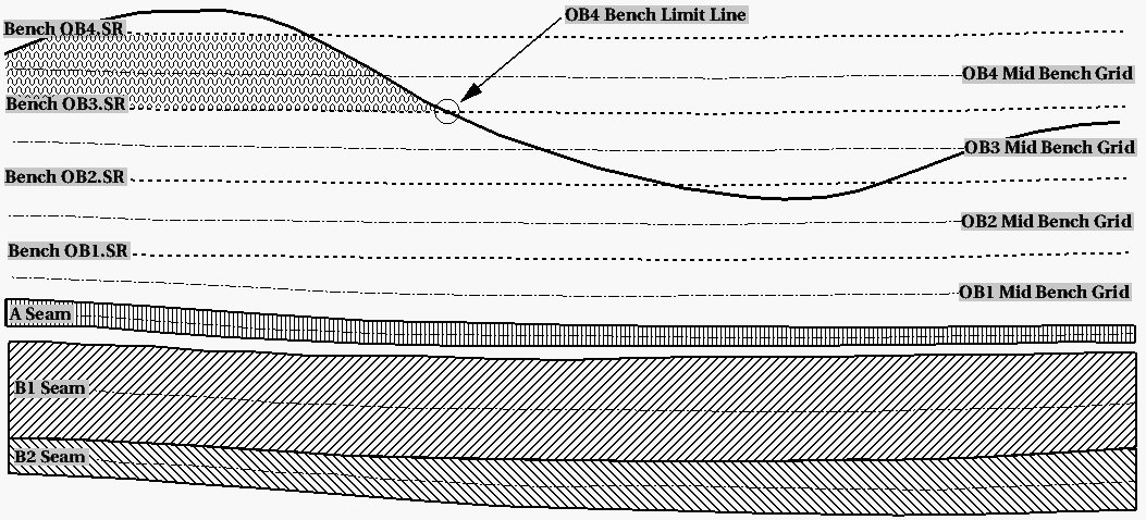 Coal seams may have "no coal" and "sub-crop" polygons that make up coal bench limits. Diagram 3 shows the reserve area under consideration. The green polygon is the proposed mine area. The shaded area is the polygon created by a Grid Calc macro for the overburden bench 4. The naming convention used for limit polygon layers is<bench>LIM, for exampleOB4LIM.