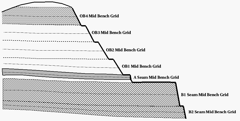 Create a set of mining bench grids Based on the coal seam grids and topography, first create a set of mining bench grids, mid-bench grids and bench thickness grids (Diagram 2). A