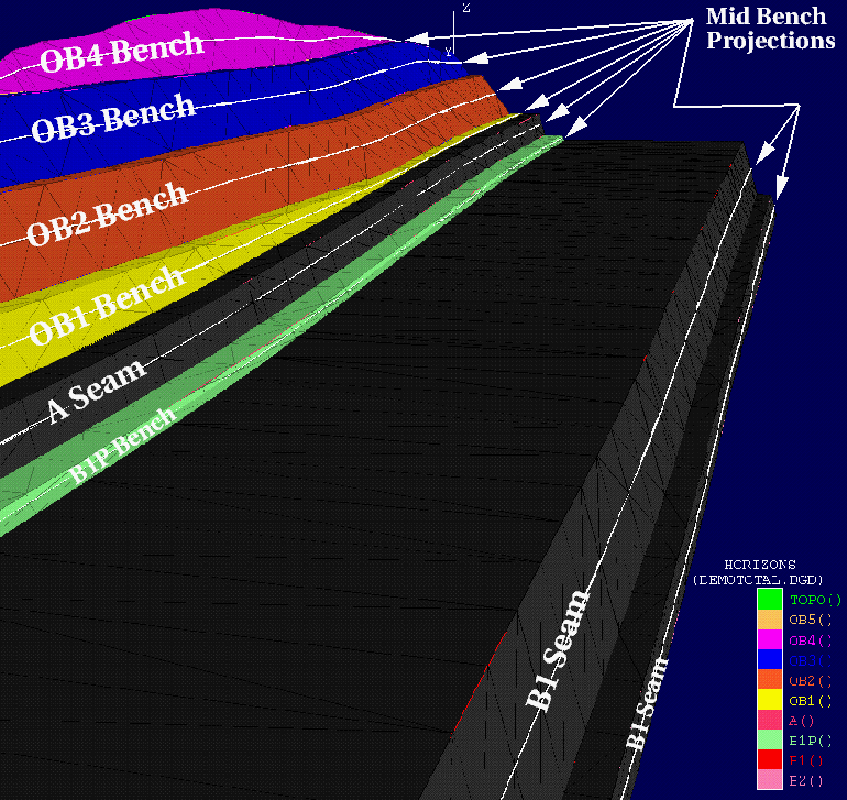 Use the Horizon Visibility option (under the Open Pit > Benching and Batters submenu) to make individual mid bench wall projections. From these, use the Build option (under the Design > Polygon Edit submenu) to create a projected block layout according to the design. Save each of the mid bench block layouts in layers named after the mining bench, for example B2, B1, B1P, A, OB1, OB2, OB3, OB4, OB5.