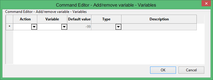 Specify whether you are adding or removing a variable, followed by the name of the variable that you are adding or removing. When adding variables, you will need to specify a default value, the type of numerical variable that you are adding as well as a description. Click the OK to return to the Add/remove variable panel.