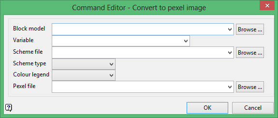 Use the Convert to pexel image command to convert a Vulcan block model (.bmf) into a pexel file based on the colour legend of a specified variable in the model.