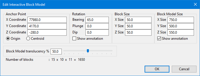Once an origin has been selected, the Edit Interactive Block Model panel will be displayed.