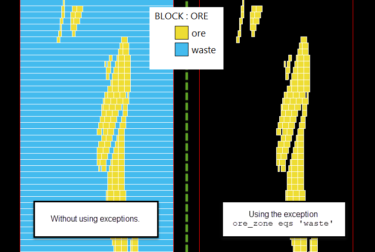 In our example, we added the exceptions ore_zone eqs 'waste'. This means that any block in which the variable ore_zone has a value of waste was not created, as shown here.