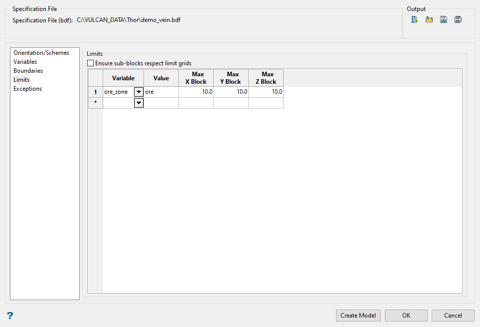 Limits are optional and allow you to restrict the size of blocks that are built in a specified block model area.
