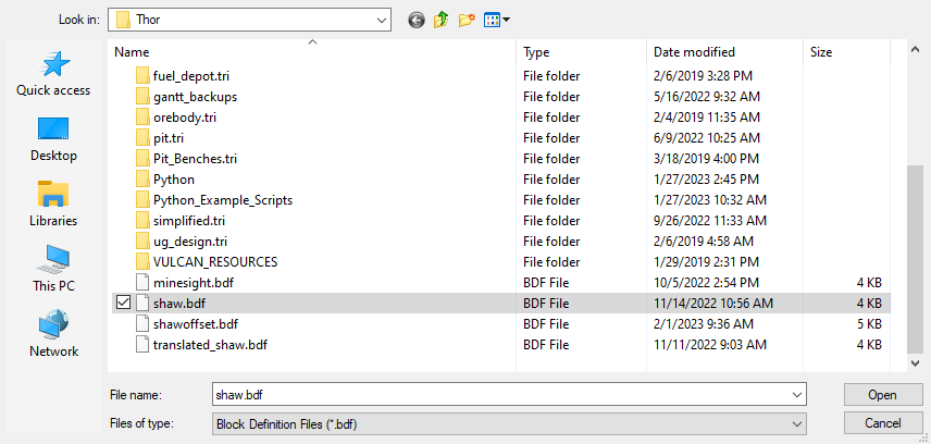Select the desired block model definition file from the browser window, then click Open.