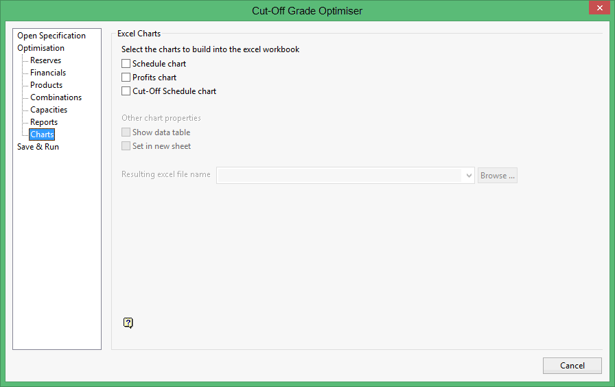The Charts section to export the outputs as a chart in a Microsoft Excel spreadsheet. The following chart types are available: