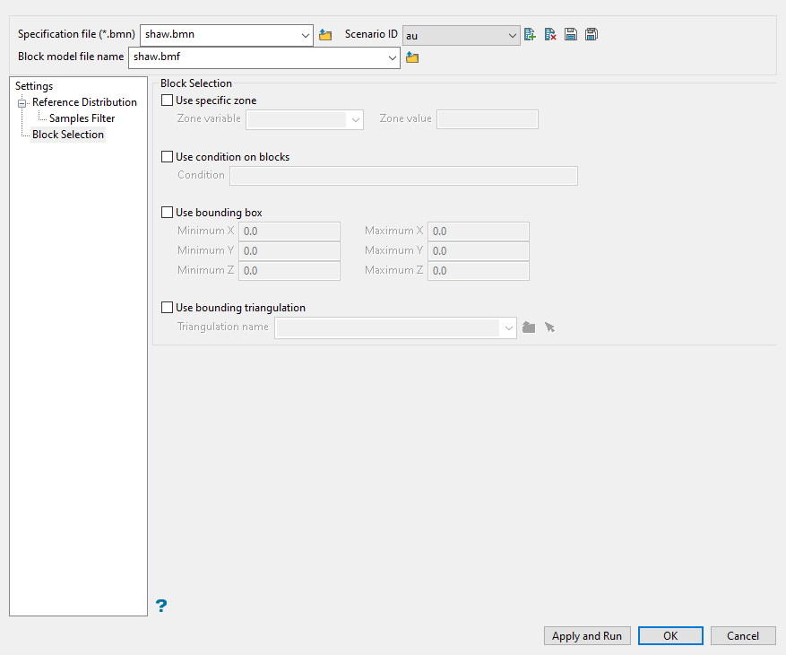 Select this checkbox to limit the estimation to those blocks that lie within a specific solid triangulation. The triangulation name can either be manually entered or selected from the drop-down list. Click Browse to select a file from another location. You can also select loaded triangulations by clicking the