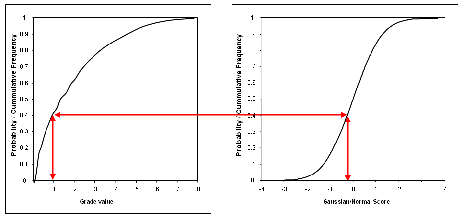 The Normal Score transformation is used to transform from the grade distribution to a standard Gaussian distribution. This transformation preserves the ordering and also has a back transformation which allows for transforming from the Gaussian space to the grade units. Refer to the Normal Score Back option for details on how to transform block model Gaussian values to the original grade values.