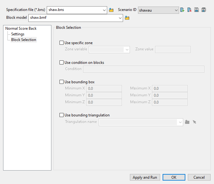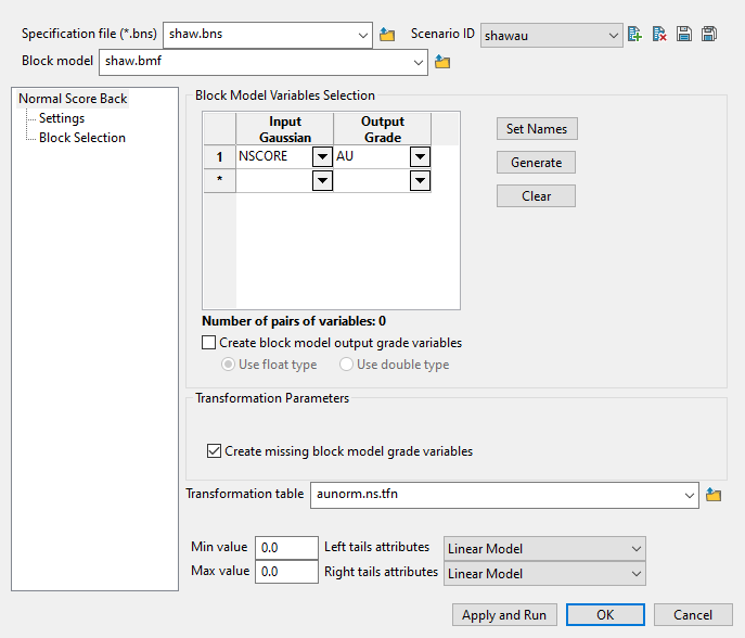 Use the Normal Score Back option to use an existing Normal Scores transformation lookup table and transform the block model values that are in Gaussian units back to the original grade units.
