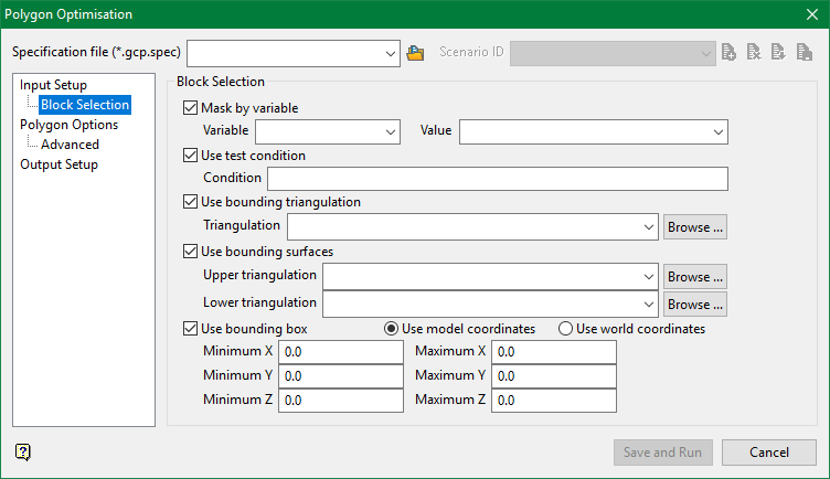 Select the Use bounding triangulation checkbox to restrict the blocks by a triangulation. Select the bounding triangulation to use from the Triangulation drop-down list, or click Browse... to select a triangulation from a location other than your working directory.