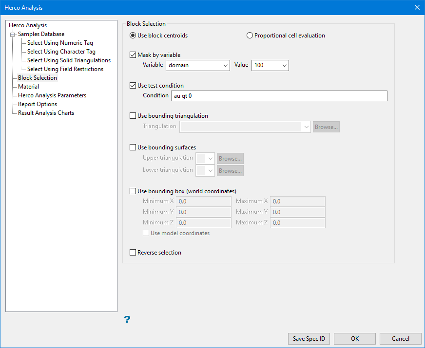 Materialin your block model and want to restrict blocks to those where the material equals ore, selectMaterialas the variable and enteroreas the value. However, if you require all blocks that do not have this specified value, then enable the Reverse selection checkbox towards the bottom of the panel.You can also limit the blocks by Use test condition for a numeric block model variable.