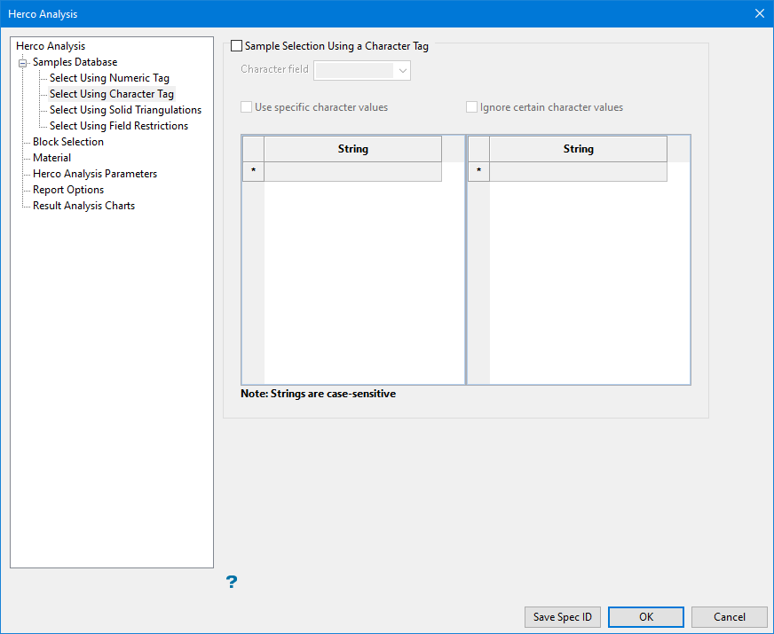 Select this checkbox to limit the samples using a specific character field. Once you select the character field you want to use, you can select specific character strings to use or ignore.
