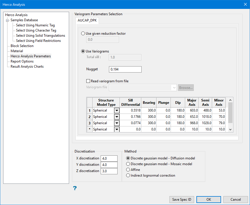 On this panel, you will select the variogram model, discretisation, and method (Affine, DGM, ILC). The tabs appearing across the top of the Herco Analysis Parameters panel are determined by the variables selected on the Samples Database branch. For each variable selected, a new tab will be created on the Herco Analysis Parameters tab.