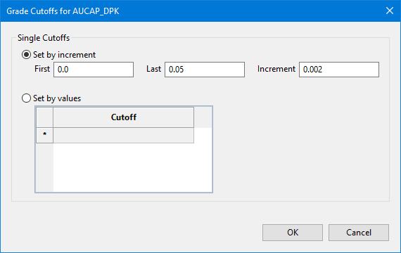Grade Cutoffs - Grade cutoff values may be specified as a range (first and last values), increment, or explicitly by value. Click
