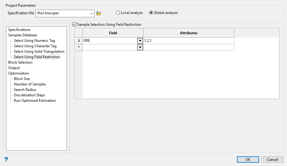 Enable Sample Selection Using Field Restriction to limit the samples to those with fields that match certain selection criteria. Select a Field from the drop-down list and enter applicable selection criteria in the Attributes column. (See Appendices > Operators and Functions)