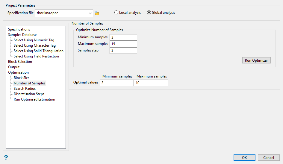 Enter the Optimal values for Minimum samples and Maximum samples after running the optimisation and reviewing the results. These values will be shown on the Optimisation pane and used when using the option Run Optimised Estimation.
