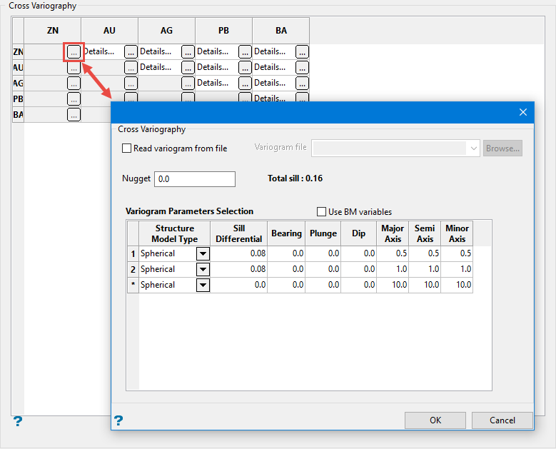 Click the icon for the cross variogram pair you want to edit. A new panel will be displayed that allows you to edit the input parameters for the variograms.