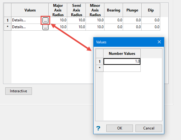 Enter the values associated with the selected soft boundary. This panel will differ depending on whether the current boundary has a number or character value associated with it. Samples that have the values in this list for the soft boundary variable will be forced to use the ellipsoid specified in the next six boxes.