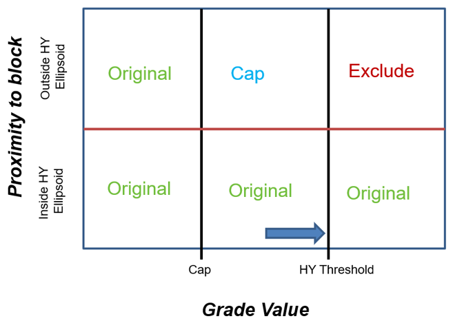 Important: Using this option will not place a grade cap on the high-yield samples. It will prevent them from being used in the estimation completely if a sample has a value for a given field higher than a specified threshold and when the sample is beyond an ellipsoidal region centred in the block being estimated.
