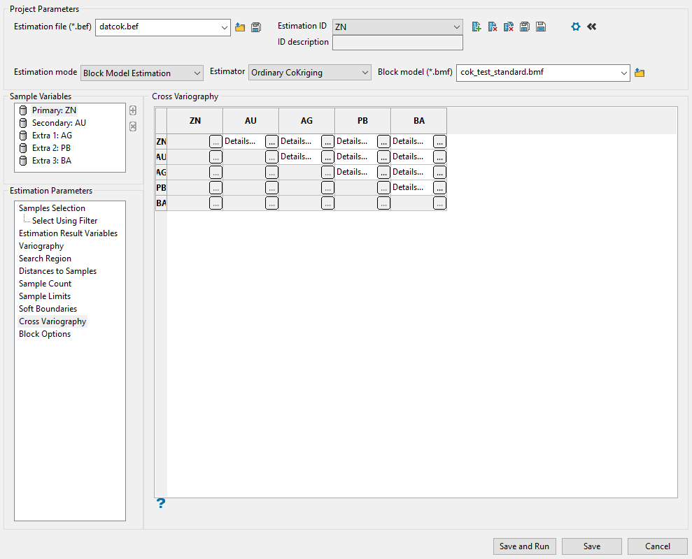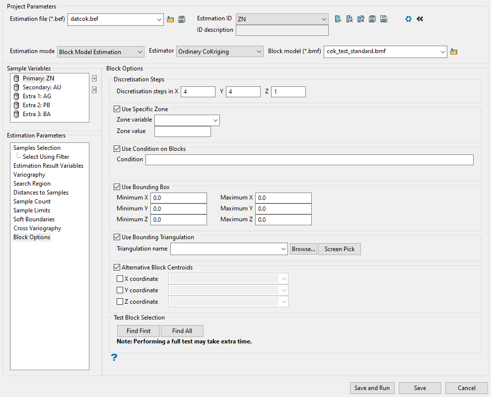 Use the Multivariate Estimation Editor option to perform cokriging grade estimations on your block model. The Multivariate Estimation Editor allows you to set up parameters used to perform Simple CoKriging, Ordinary CoKriging, Standarised CoKriging, and Traditional Ordinary CoKriging for multiple variables.