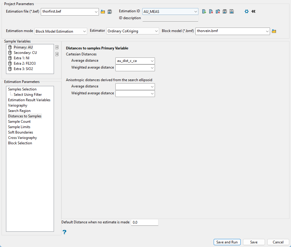 Use this panel to set the parameters to store the search distances used to look for your samples. Any, all, or none of the different distance measures can be stored by putting a block model variable name in the appropriate panel item. If you do not want to store a value, then leave the panel item blank.
