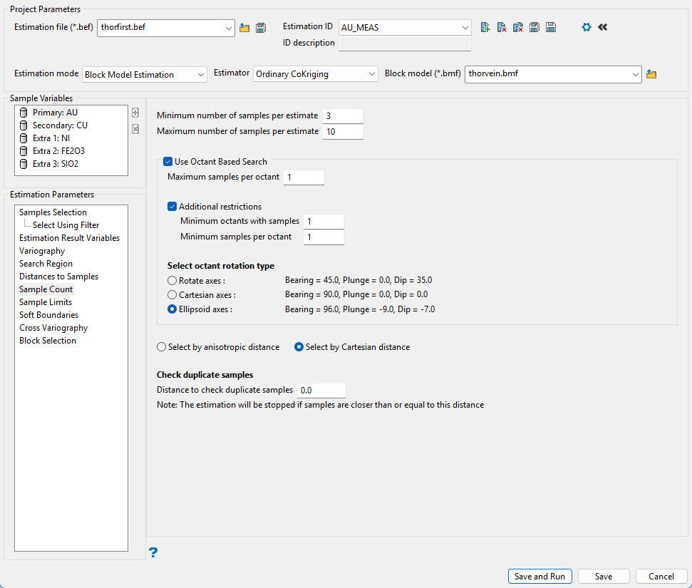 Example: The estimation program may find 30 samples near a block centre. If you had specified a maximum of 10 samples, then only the 10 samples closest to the block centre are used. The distance to the block centre is calculated by an anisotropic distance based on the search radii.