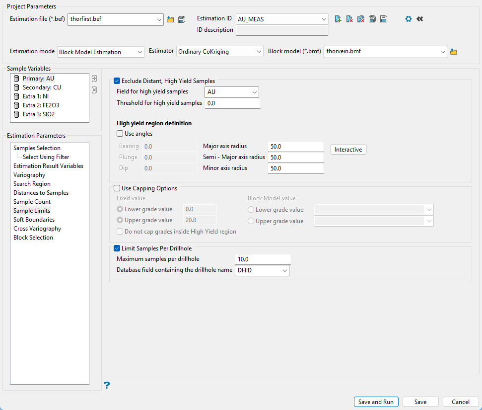 Specify the database Field for high yield samples. It is usually the same as the input grade field. However, other fields can be used to achieve special sample limits.